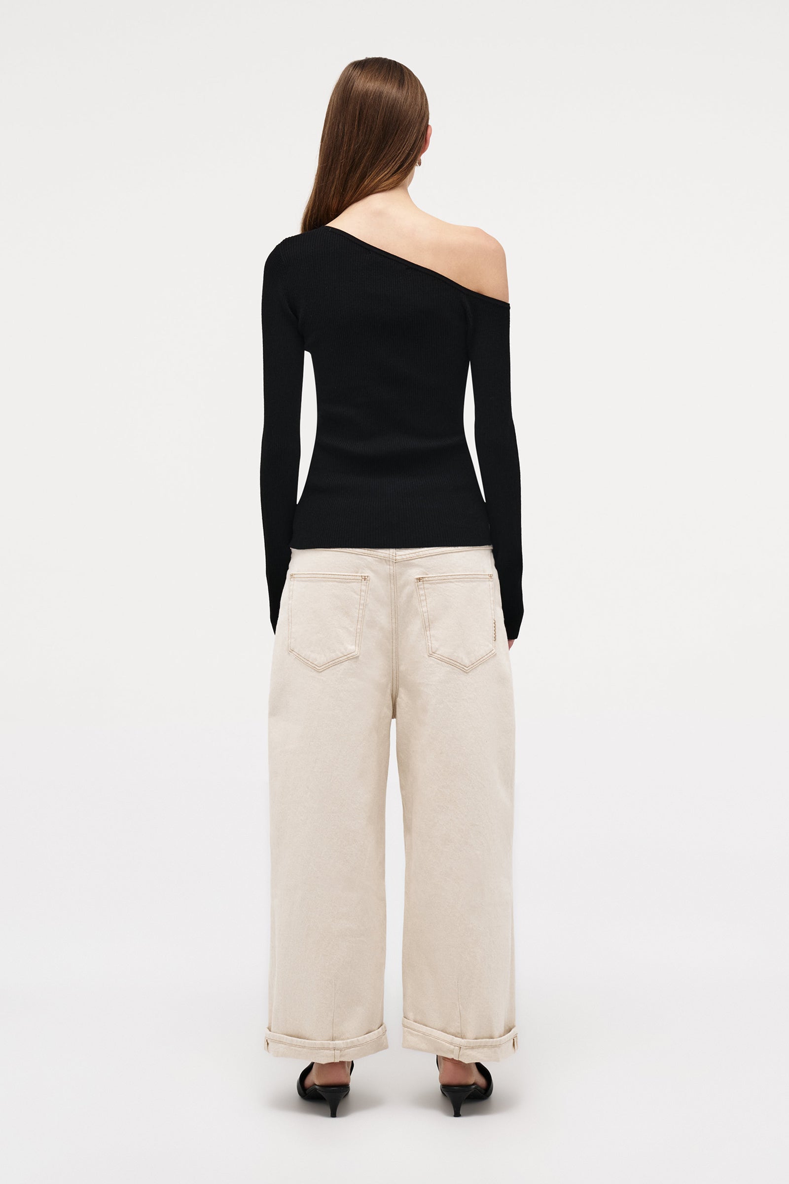 - Style with slouchy trousers or a bias-cut skirt to balance the fitted shape and highlight the asymmetric neckline