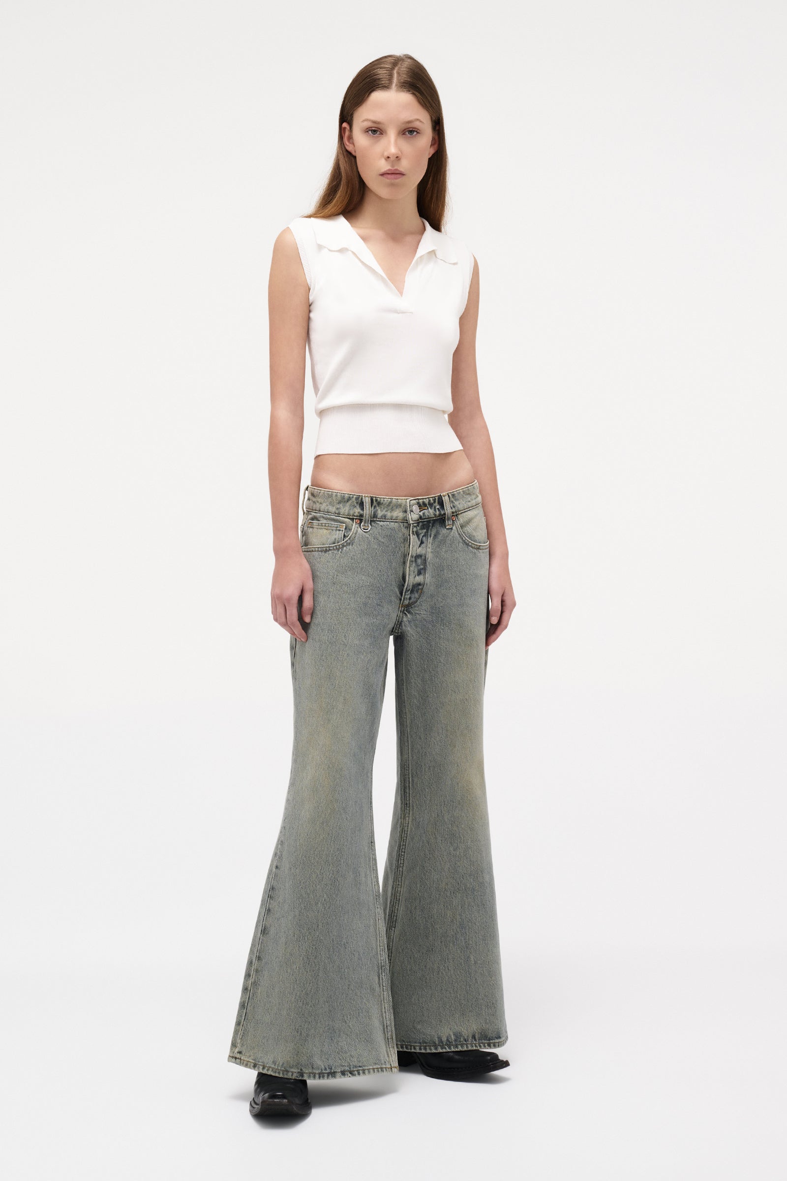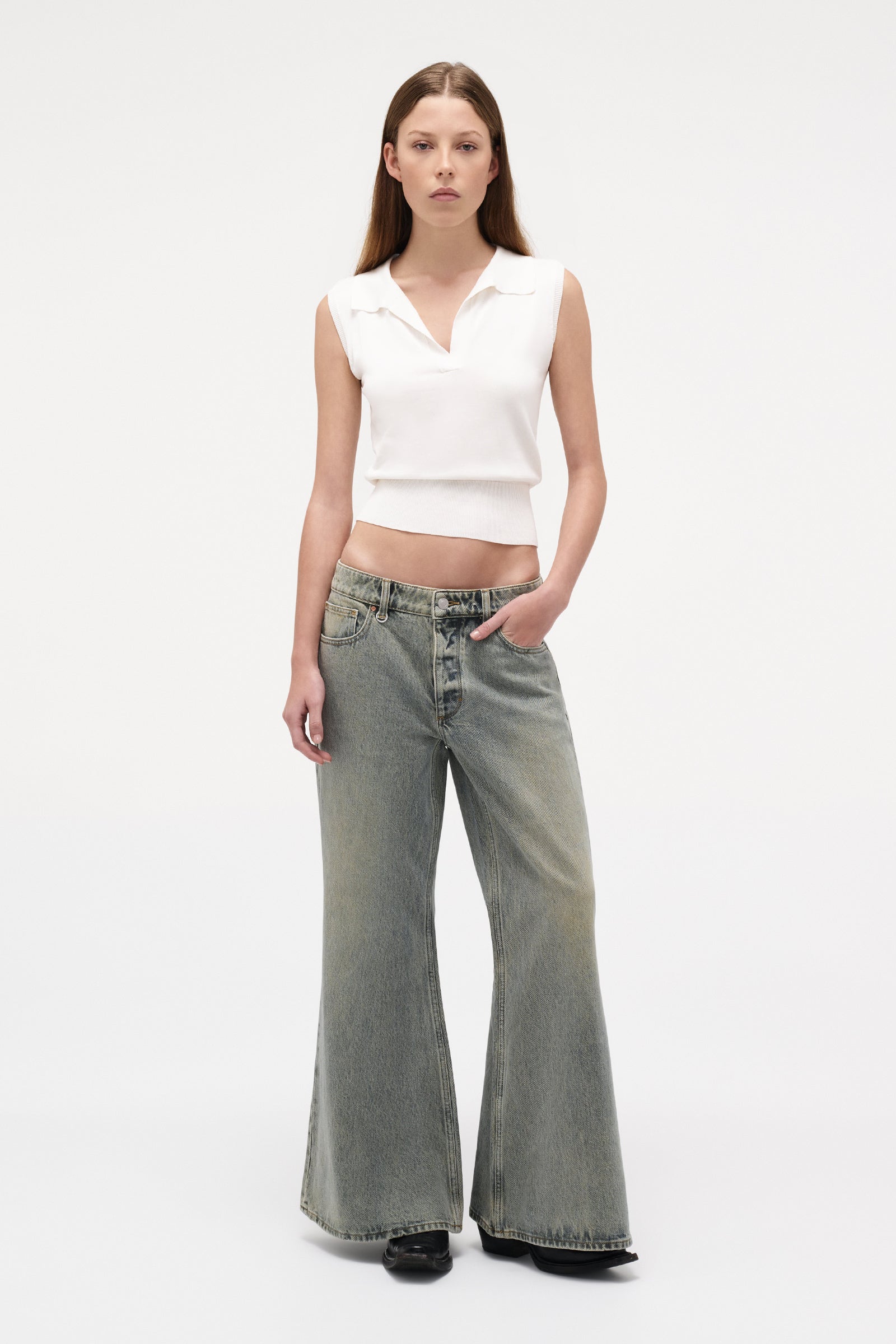 - The exaggerated wide leg and extended length create a striking, modern silhouette with effortless edge
