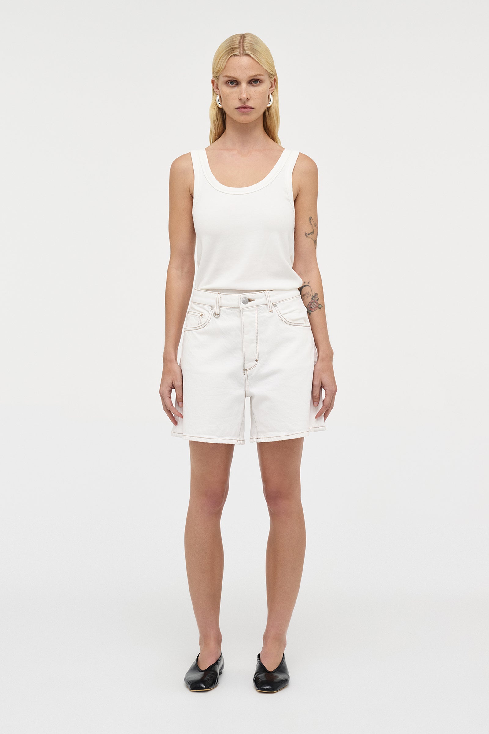 - Mid-rise fit crafted in rigid denim for a clean, structured look