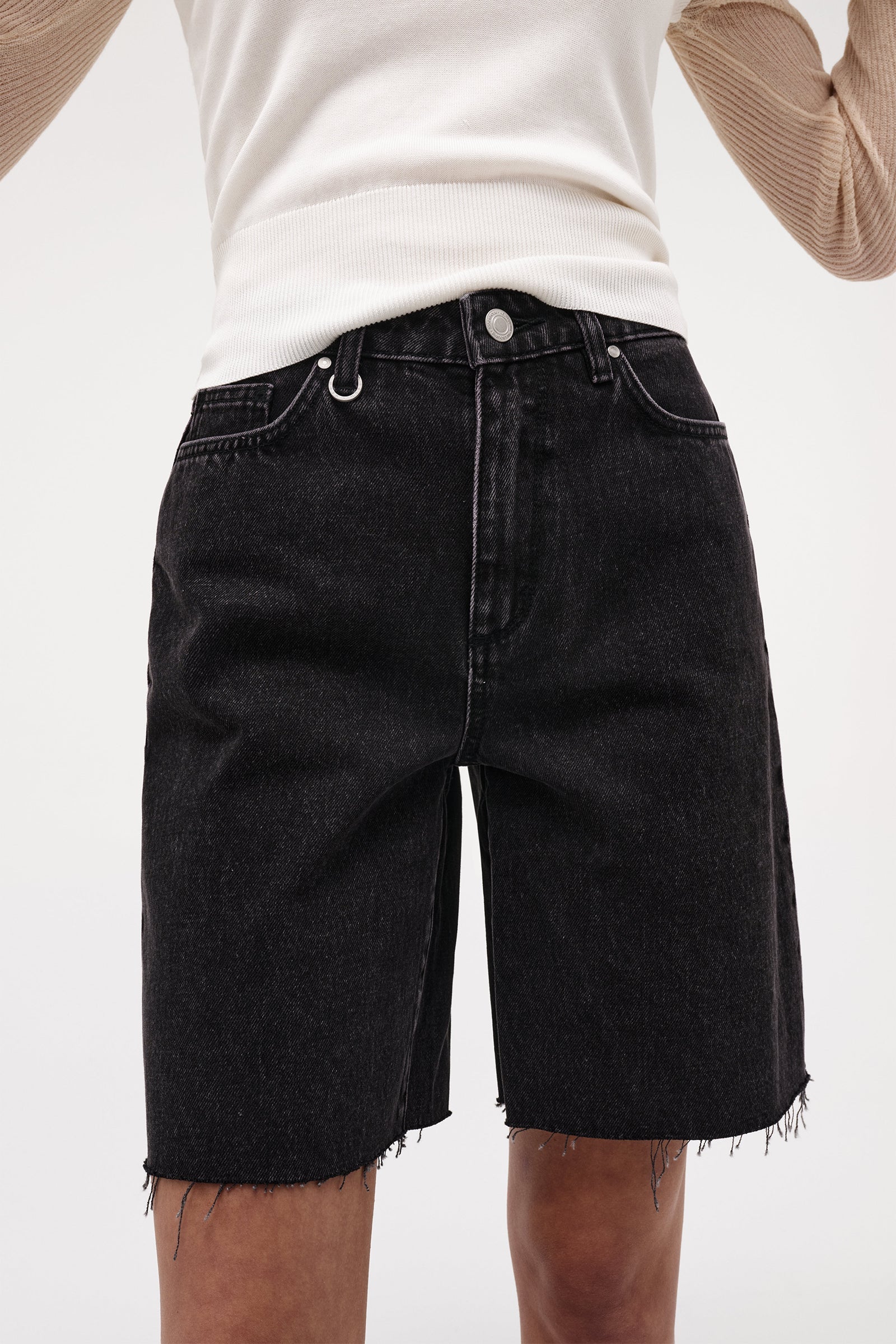 - Mid to high-rise fit, cut to an oversized knee-length silhouette that subtly flares toward the hem