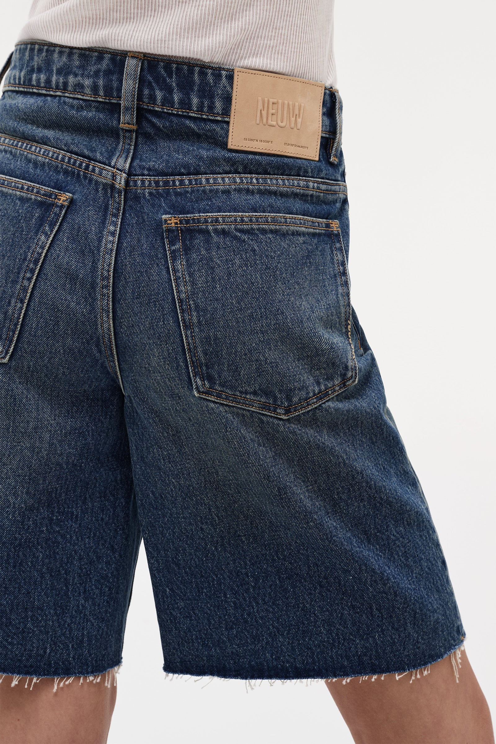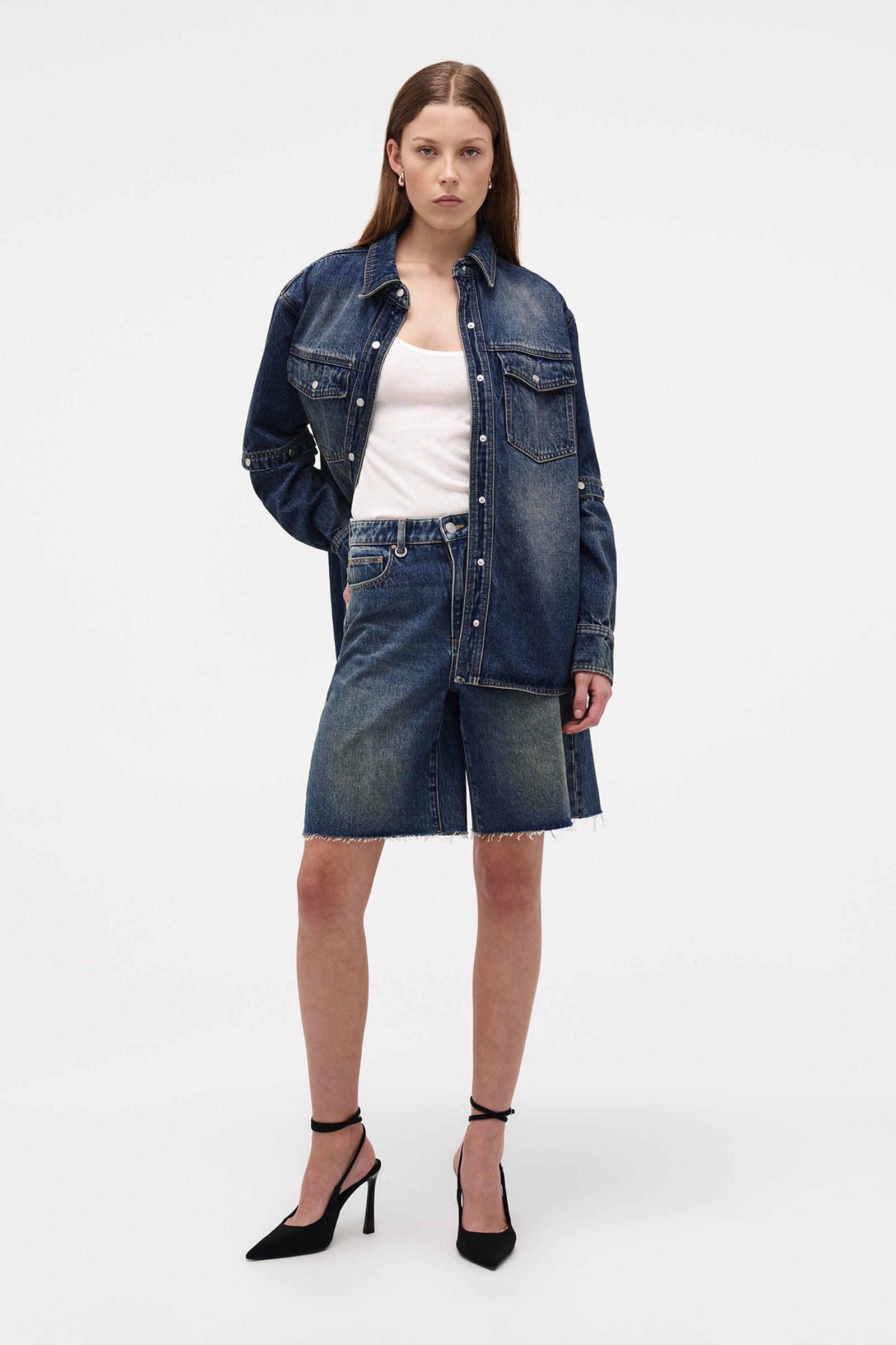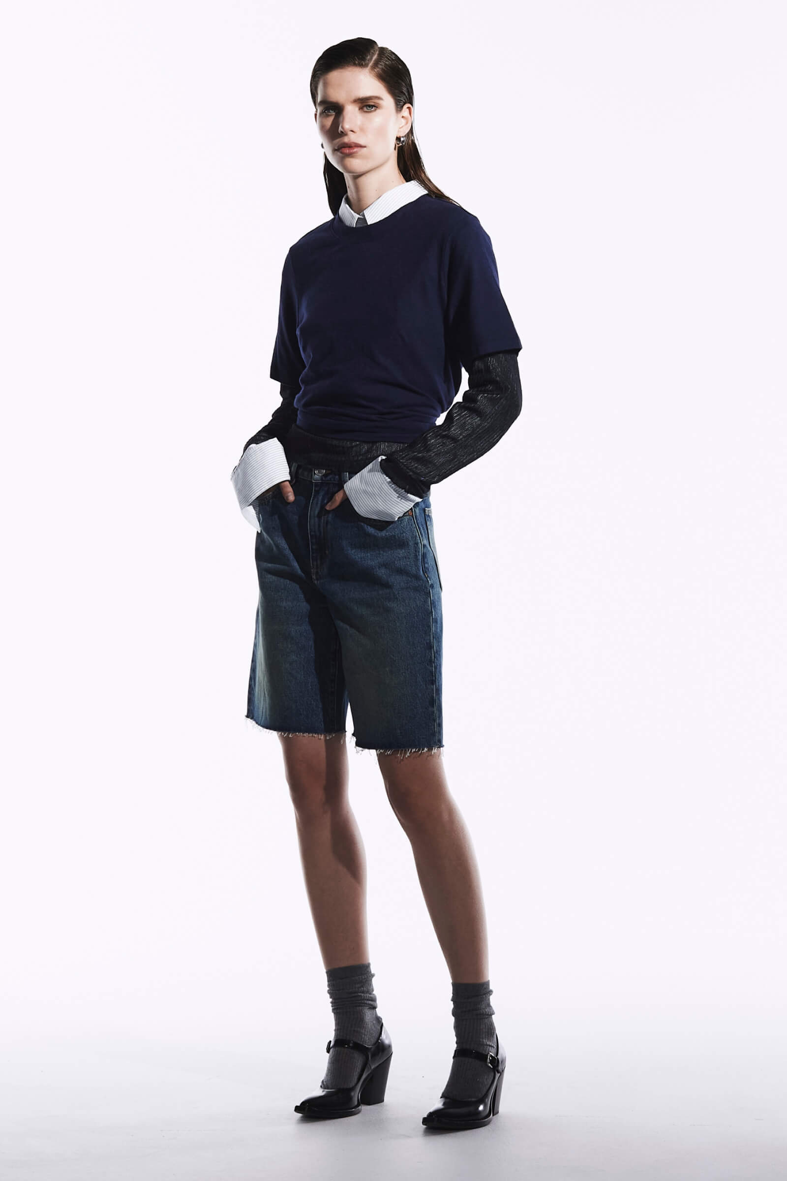 - Mid to high-rise fit, cut to an oversized knee-length silhouette that subtly flares toward the hem