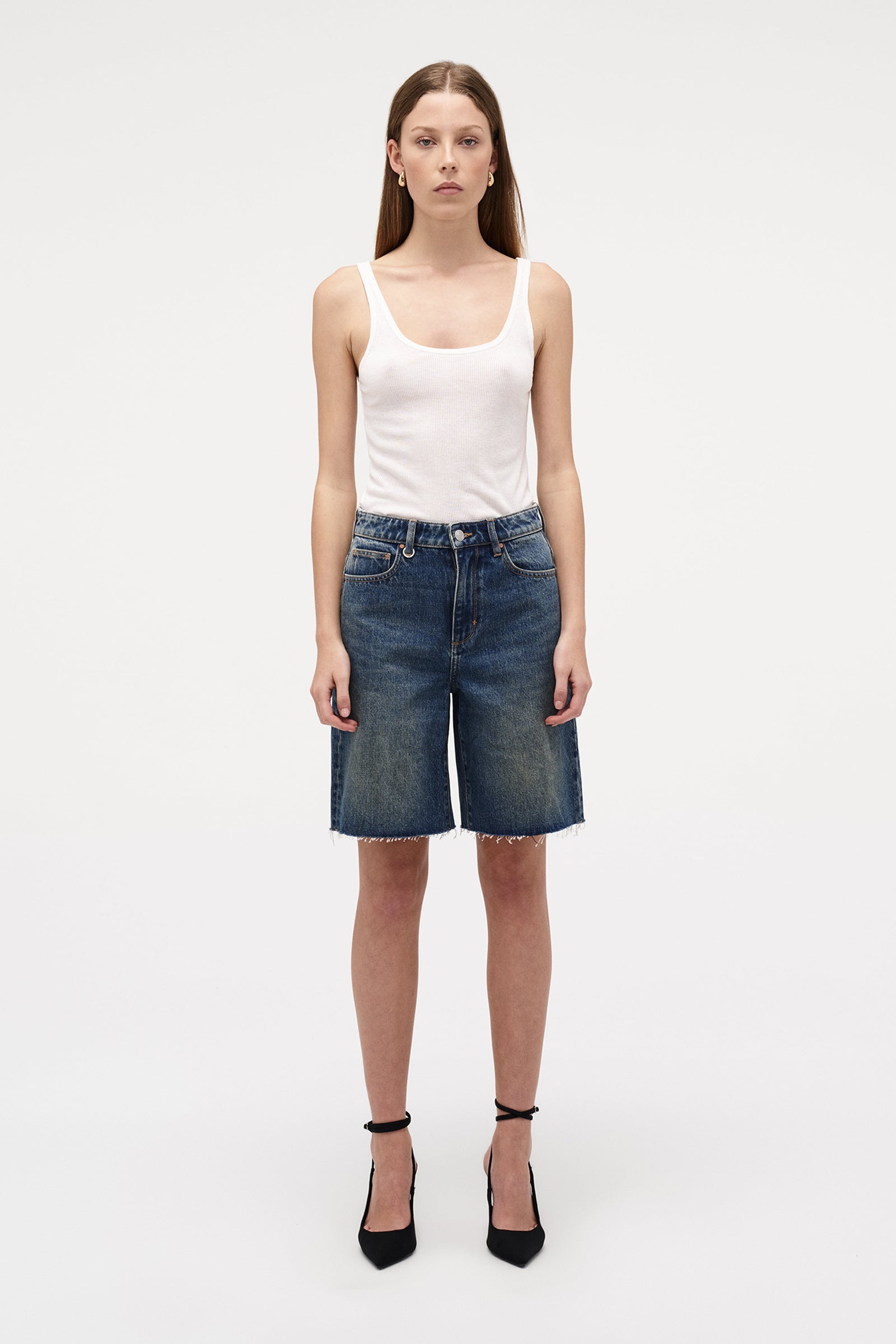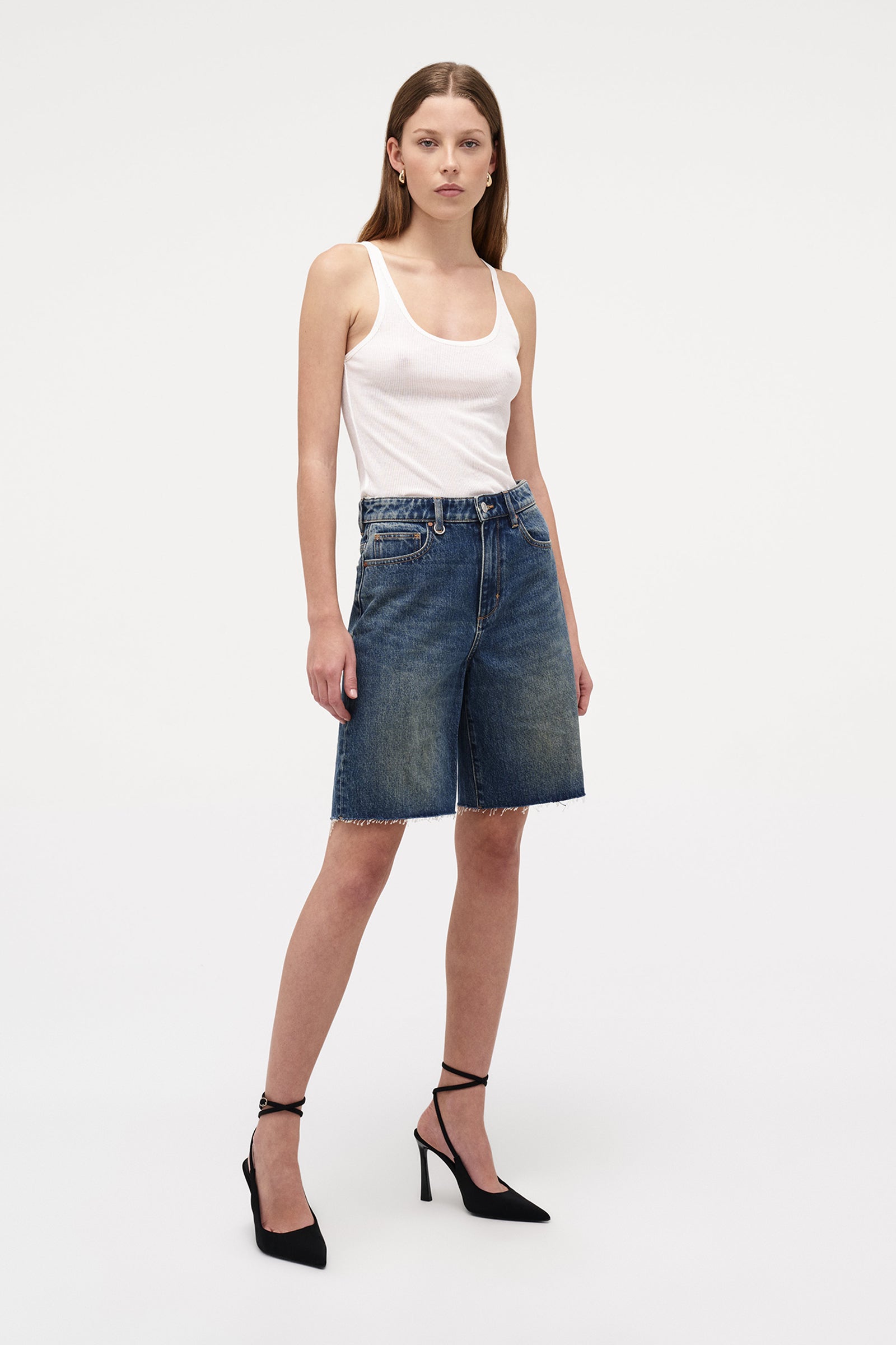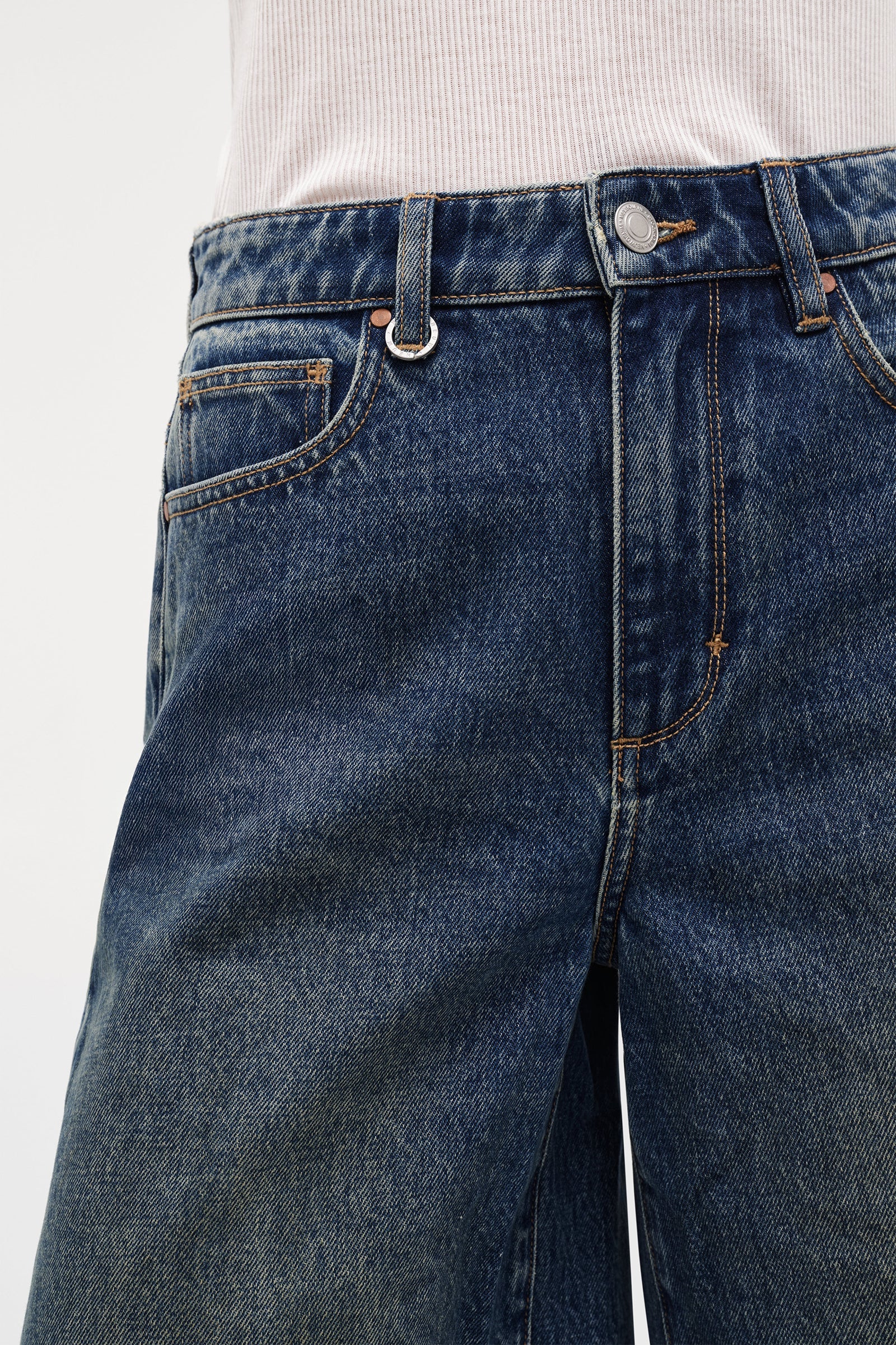 - Mid to high-rise fit, cut to an oversized knee-length silhouette that subtly flares toward the hem
