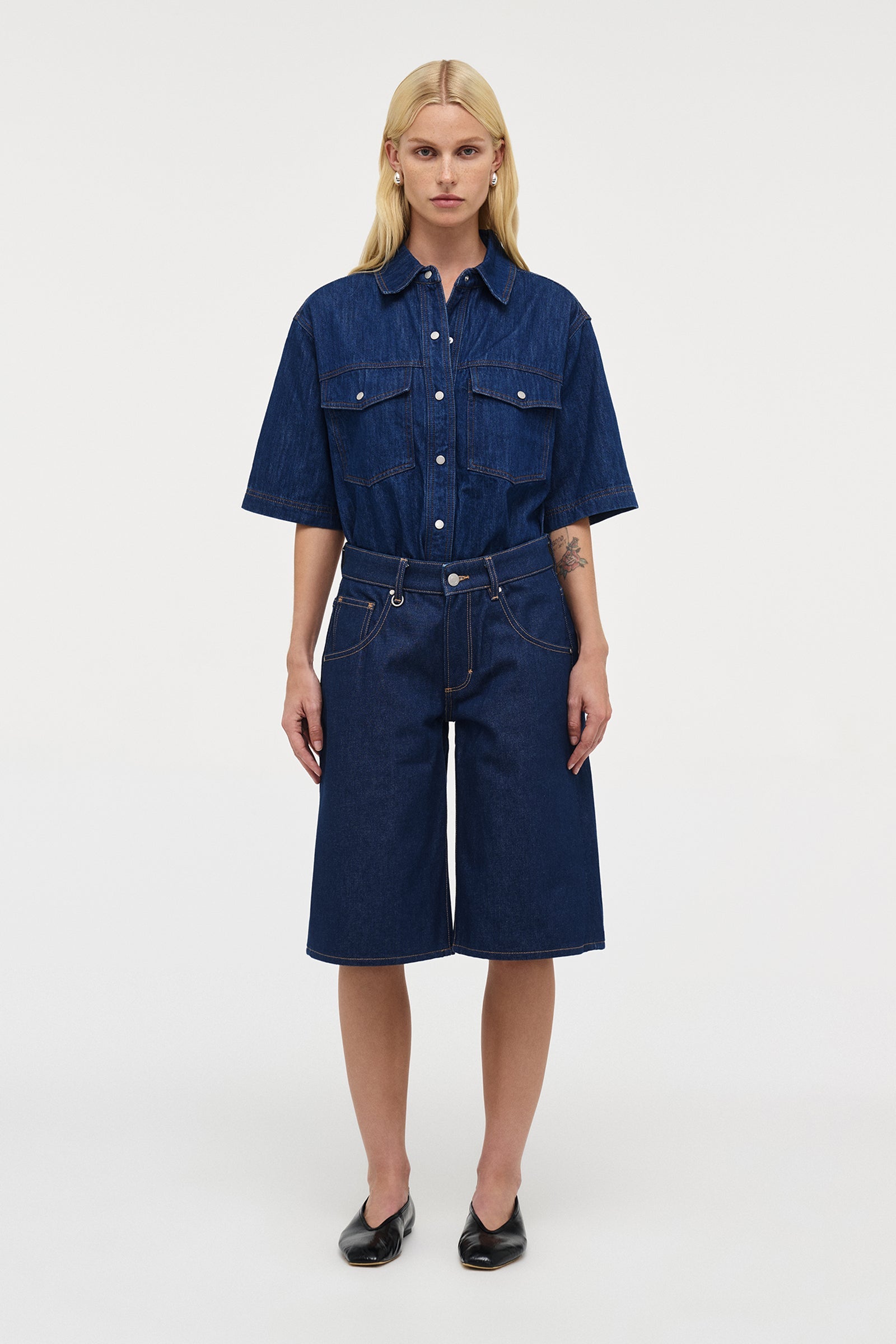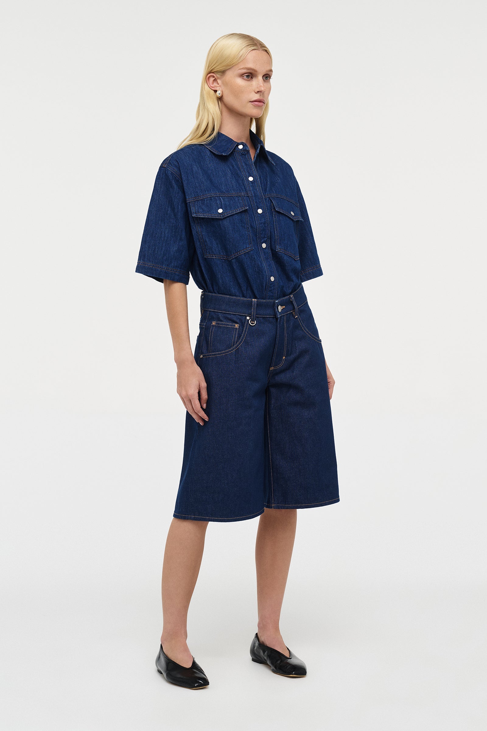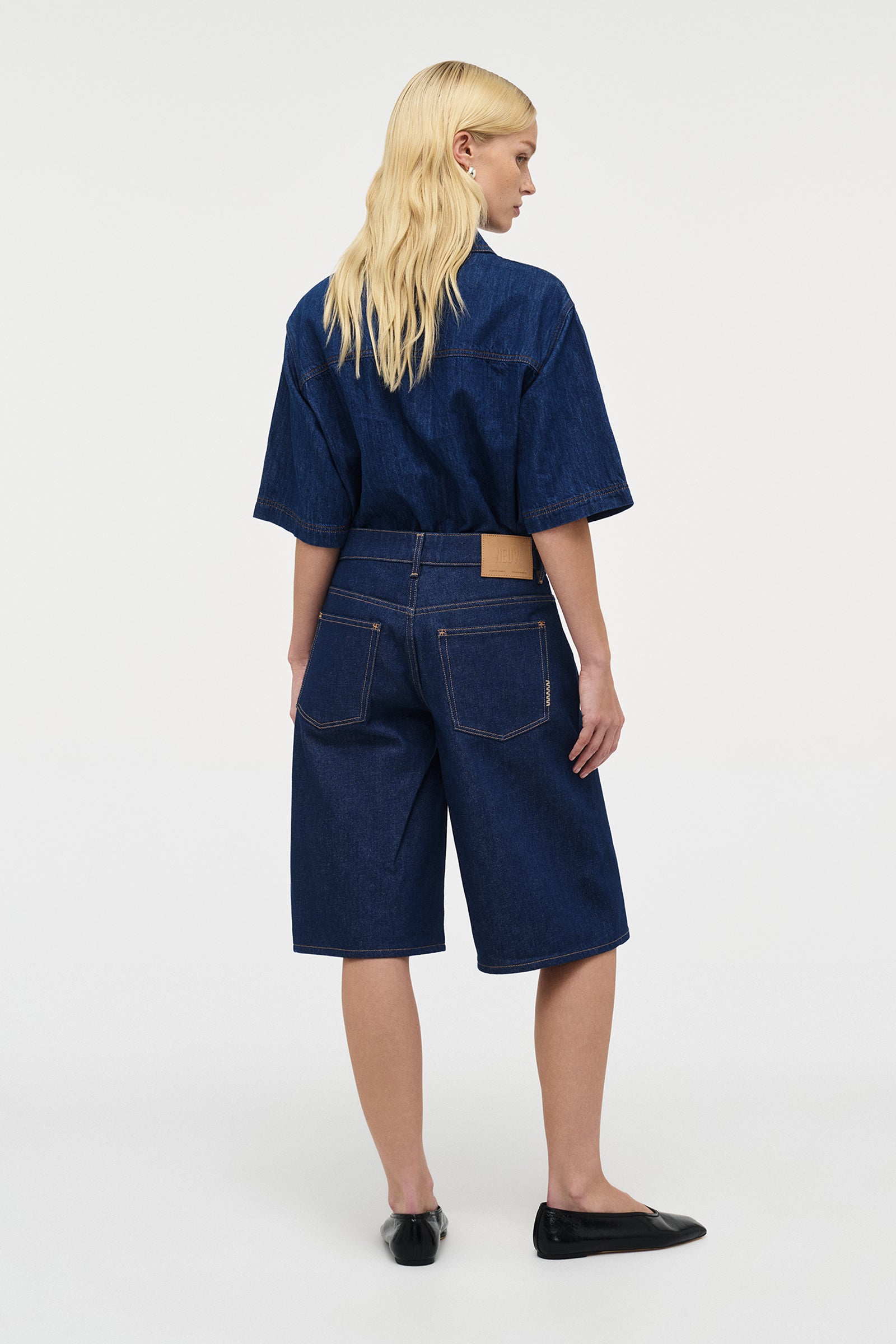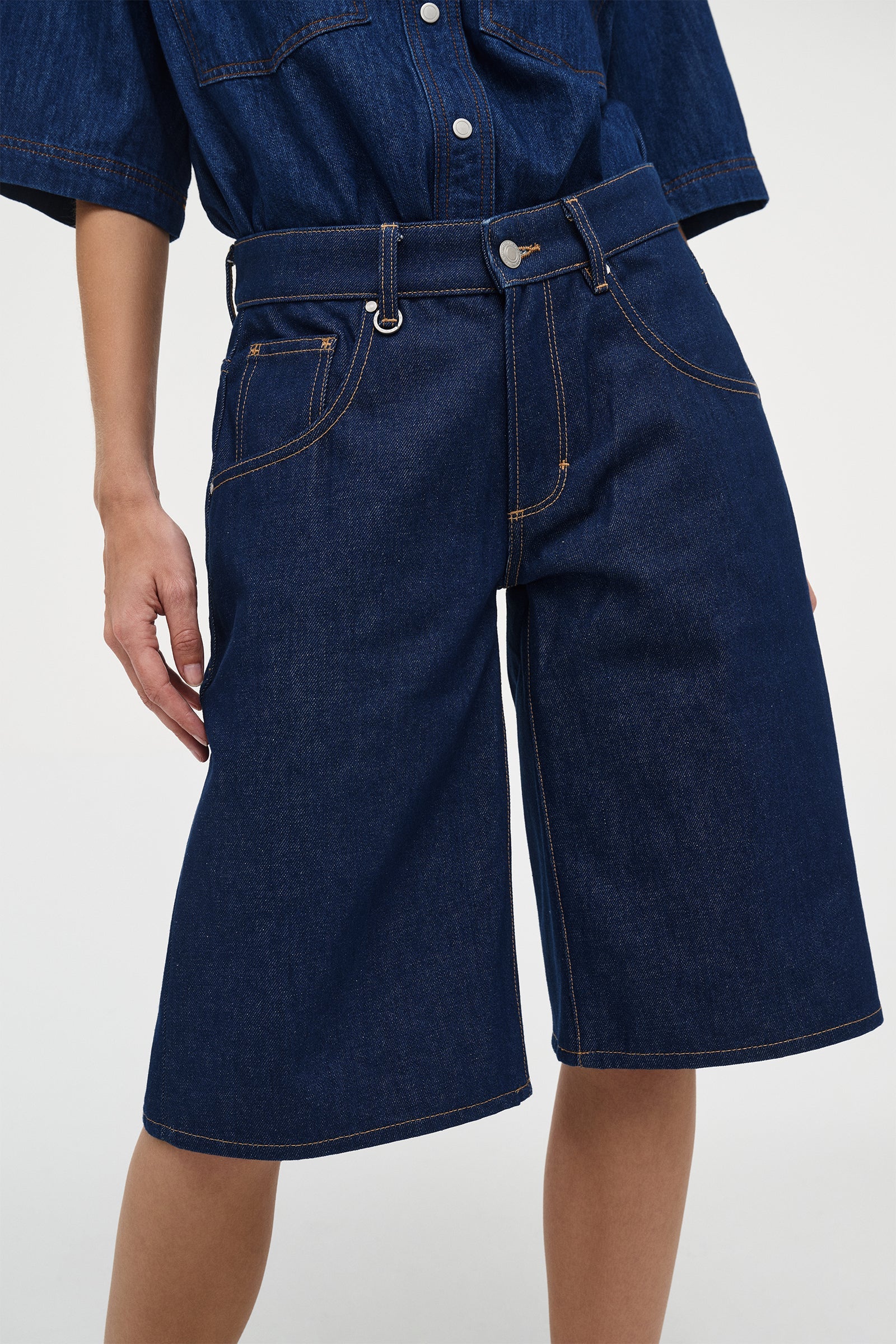 - Mid-rise, relaxed long jean short designed to sit effortlessly on the hips for a laid-back silhouette